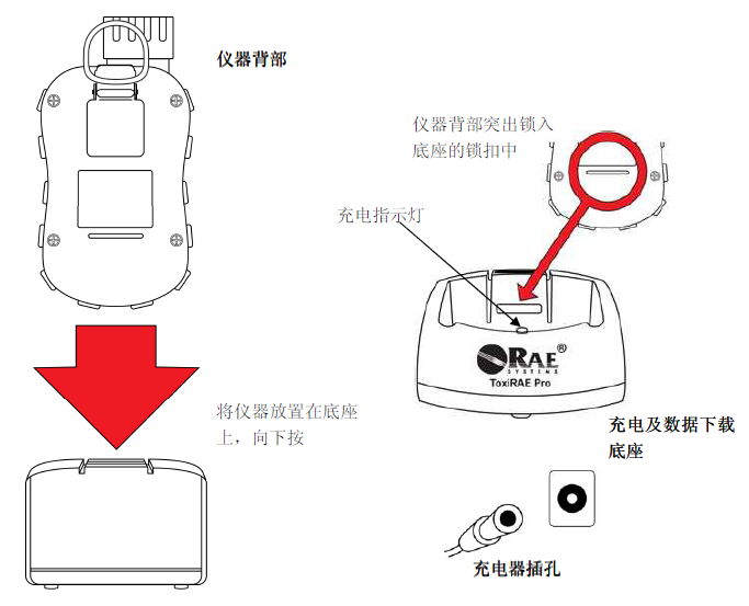 充電結束后,將充電底座后部的鎖扣向下按,即可松開鎖定、取下儀器。